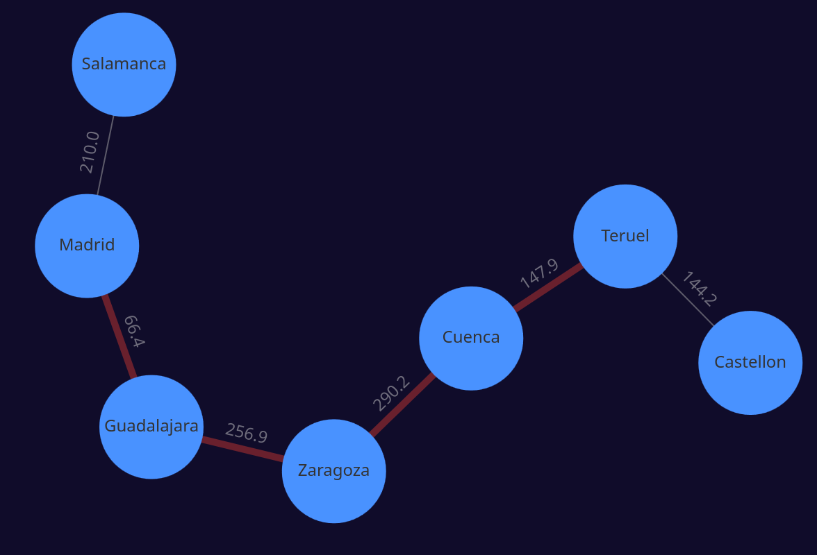 See how the weight of the edges represent the km between then. Then I'd like to know how many kilometers I'm going to drive if I'd like to go from Teruel to Madrid:
